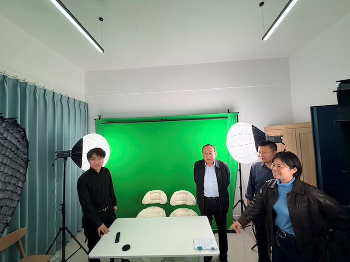 交流会结束后,安徽顶新信息技术有限公司一行人在葛向东的陪同下,实地参观了学校电商直播间,详细了解直播间的硬件配置、学生实践实训开展情况。